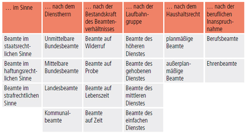 Der Begriff „Beamter“ ist vielschichtig. So lassen sich Beamte z. B. nach dem Dienstherrn in Landes- oder Bundesbeamte oder nach der beruflichen Inanspruchnahme in Berufsbeamte und Ehrenbeamte einteilen. Die folgende Abbildung vermittelt eine Übersicht über die Möglichkeiten bei der Einteilung der Beamten.