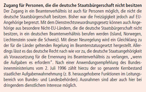 Mit dem 10. Gesetz zur Änderung dienstrechtlicher Vorschriften vom Dezember 1993 hat der deutsche Gesetzgeber die rechtlichen Voraussetzungen geschaffen, dass EU-Angehörige, die nicht im Besitz einer deutschen Staatsangehörigkeit sind, in ein Beamtenverhältnis berufen werden können. Ausgangspunkt für diese Öffnung des bundesdeutschen Beamtenrechts war Art. 48 des EWG-Vertrags, der die Freizügigkeit der Arbeitnehmerinnen und Arbeitnehmer in der Europäischen Union gewährleistet. Allerdings ist nach § 7 Abs. 2 BBG die deutsche Staatsangehörigkeit nach wie vor Voraussetzung für die Ernennung ins Beamtenverhältnis, „wenn die Aufgaben es erfordern“. Nach einer Anwendungsempfehlung des Bundesinnenministeriums vom 2. Juli 1996 zählt hier zu der so genannte Kernbestand staatlicher Aufgabenwahrnehmung (z. B. he raus gehobene Funktionen im Leitungsbereich von Bundes- und Landesbehörden).