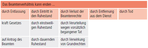 Für die Beendigung des Beamtenverhältnisses gibt es verschiedene Tatbestände, die in den Paragraphen 30ff. BBG aufgeführt sind. Der gebräuchlichste Beendigungsgrund ist der Eintritt in den Ruhestand. Die folgende Abbildung gibt einen Überblick über die Beendigungsgründe.
